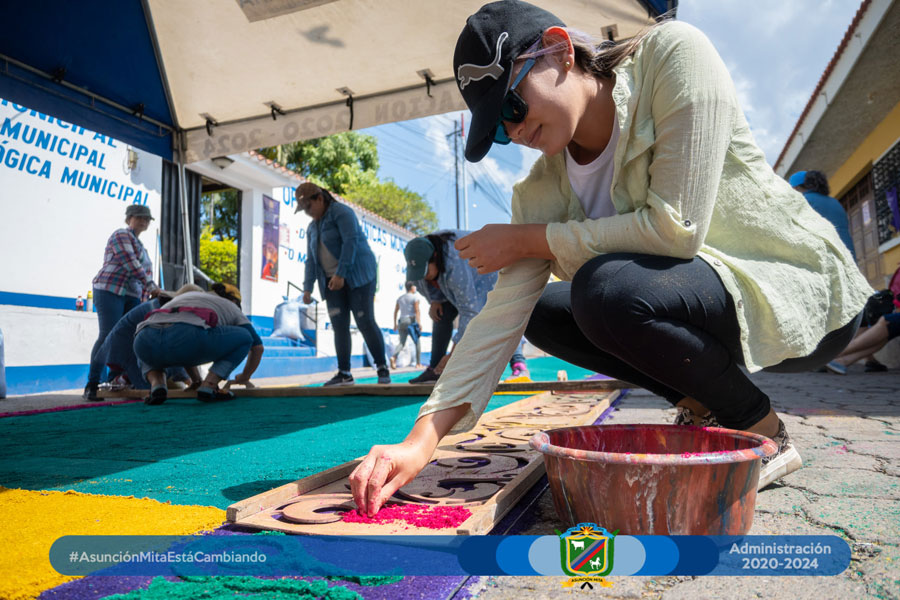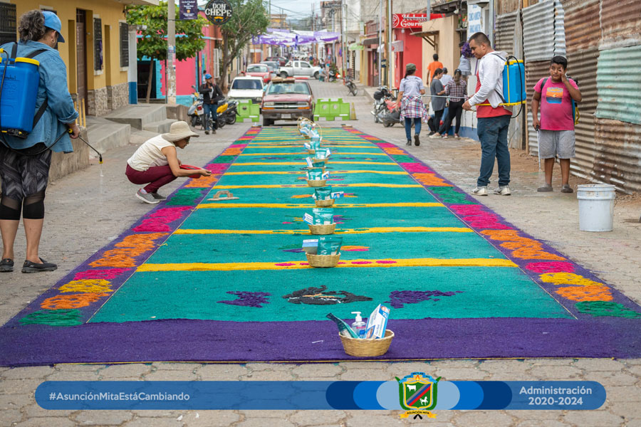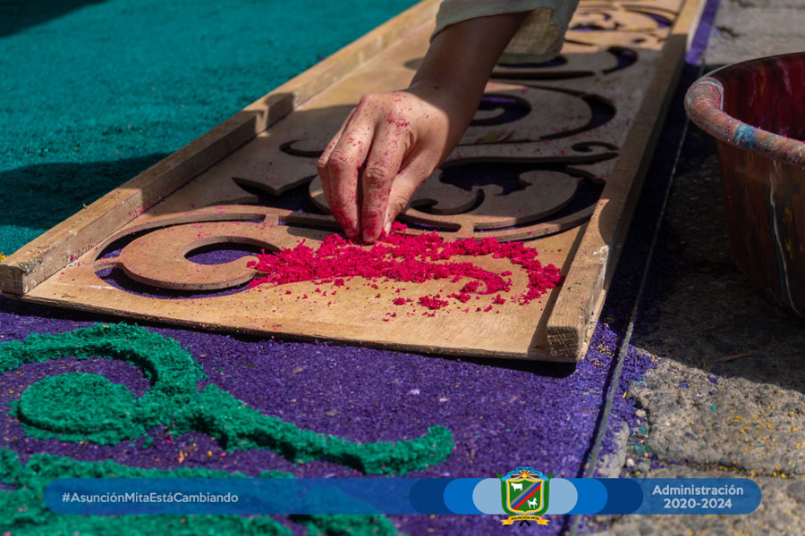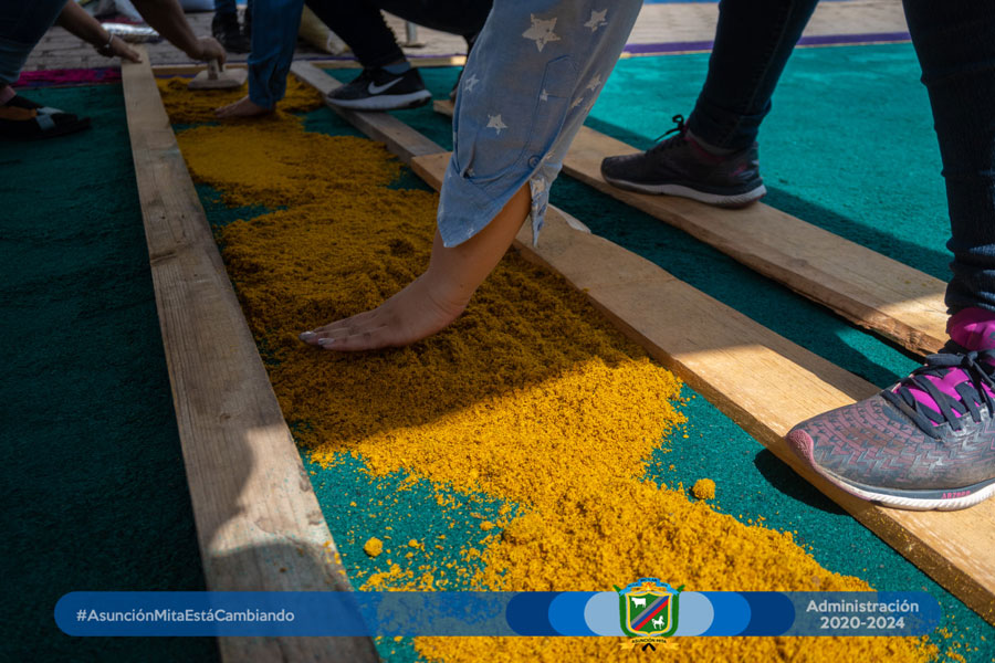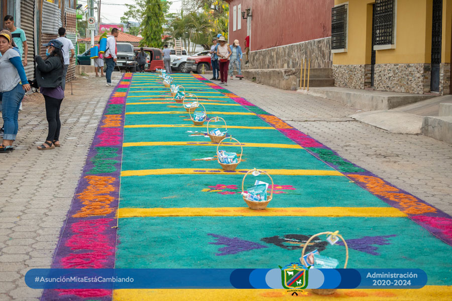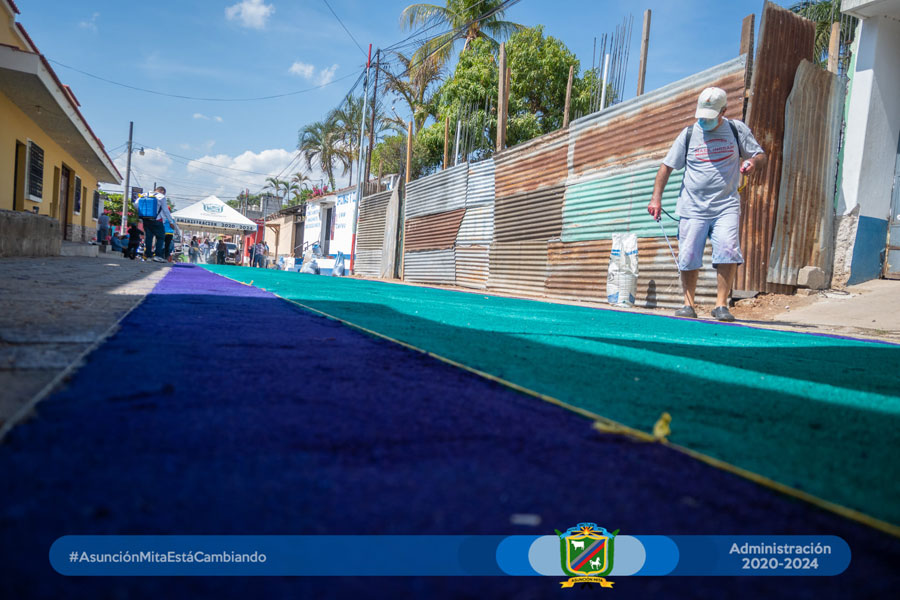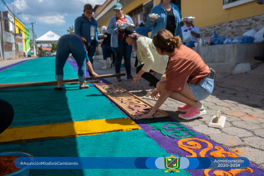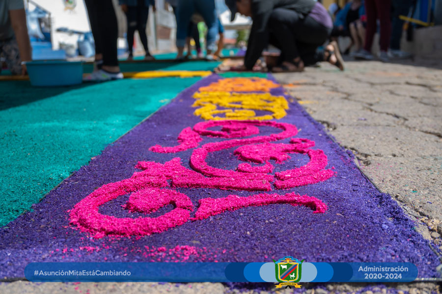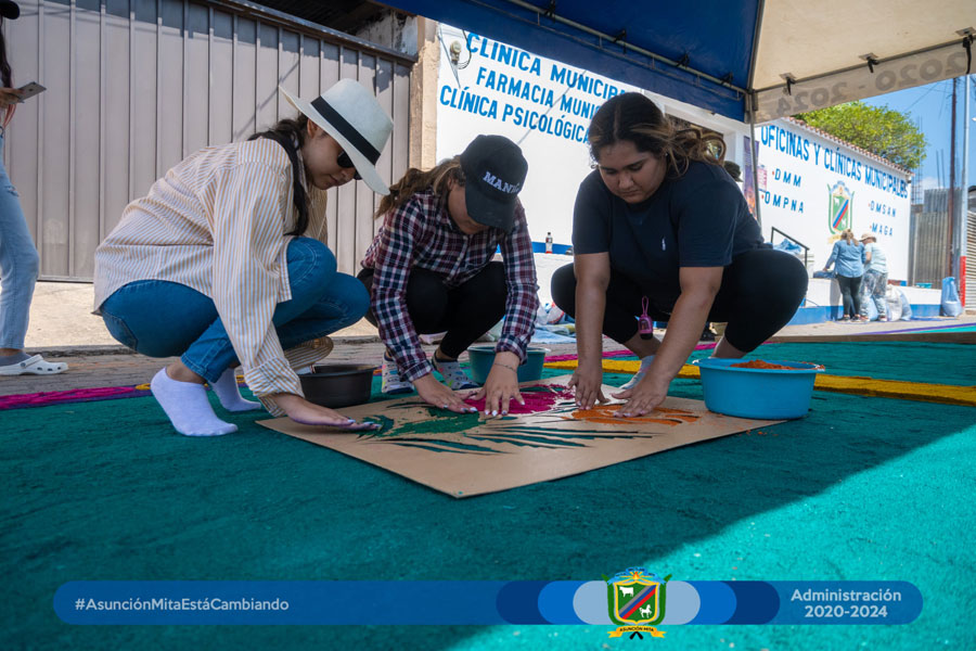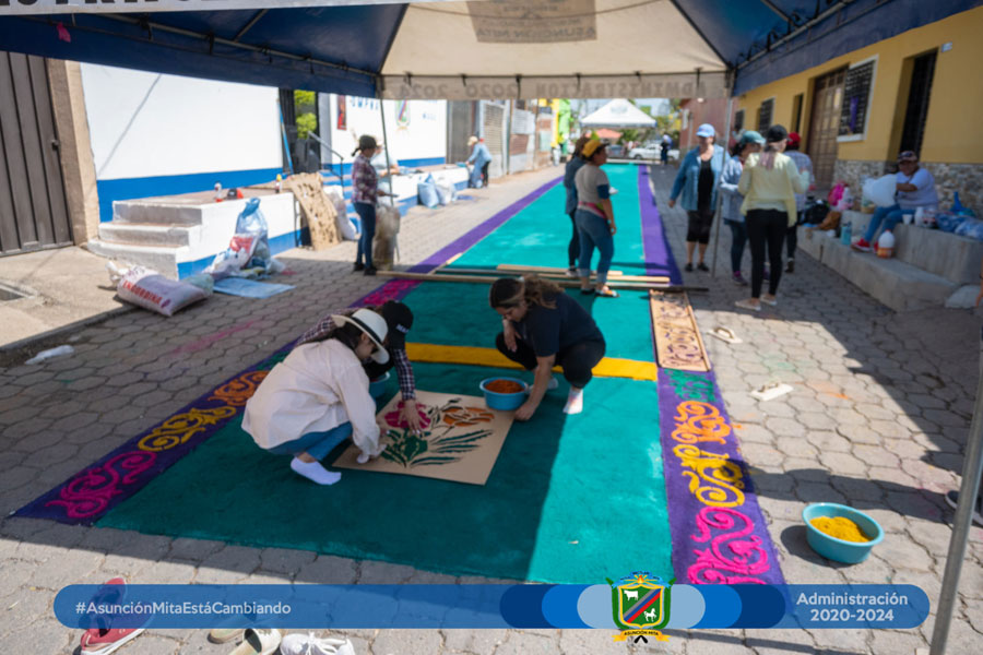 El día de hoy el equipo de mujeres colaboradoras del Anexo Municipal realizó por primera vez su alfombra a un costado de dichas instalaciones en este martes santo en espera del cortejo procesional de la venerada imagen de Jesús de la Caña.